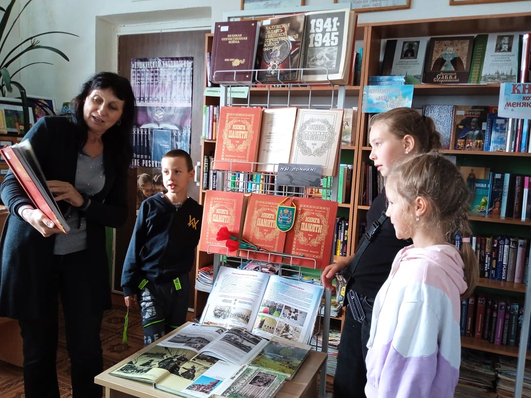 В библиотечных мероприятиях постоянно участвуют корекозевские школьники. Не осталась незамеченной ими и эта выставка. В ходе ее работы Надежда Громова рассказывает детям о боях, которые проходили на территории будущей Калужской области, а также Перемышльского района, о героях Великой Отечественной войны, в частности, о земляке, Герое Советского Союза, летчике, старшем лейтенанте Николае Харитонове.