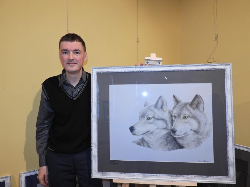 Художник по-своему ведет борьбу за сохранение животного мира Земли. На выставке представлено 30 работ, большинство из которых выполнено цветным карандашом в гиперреалистической манере.