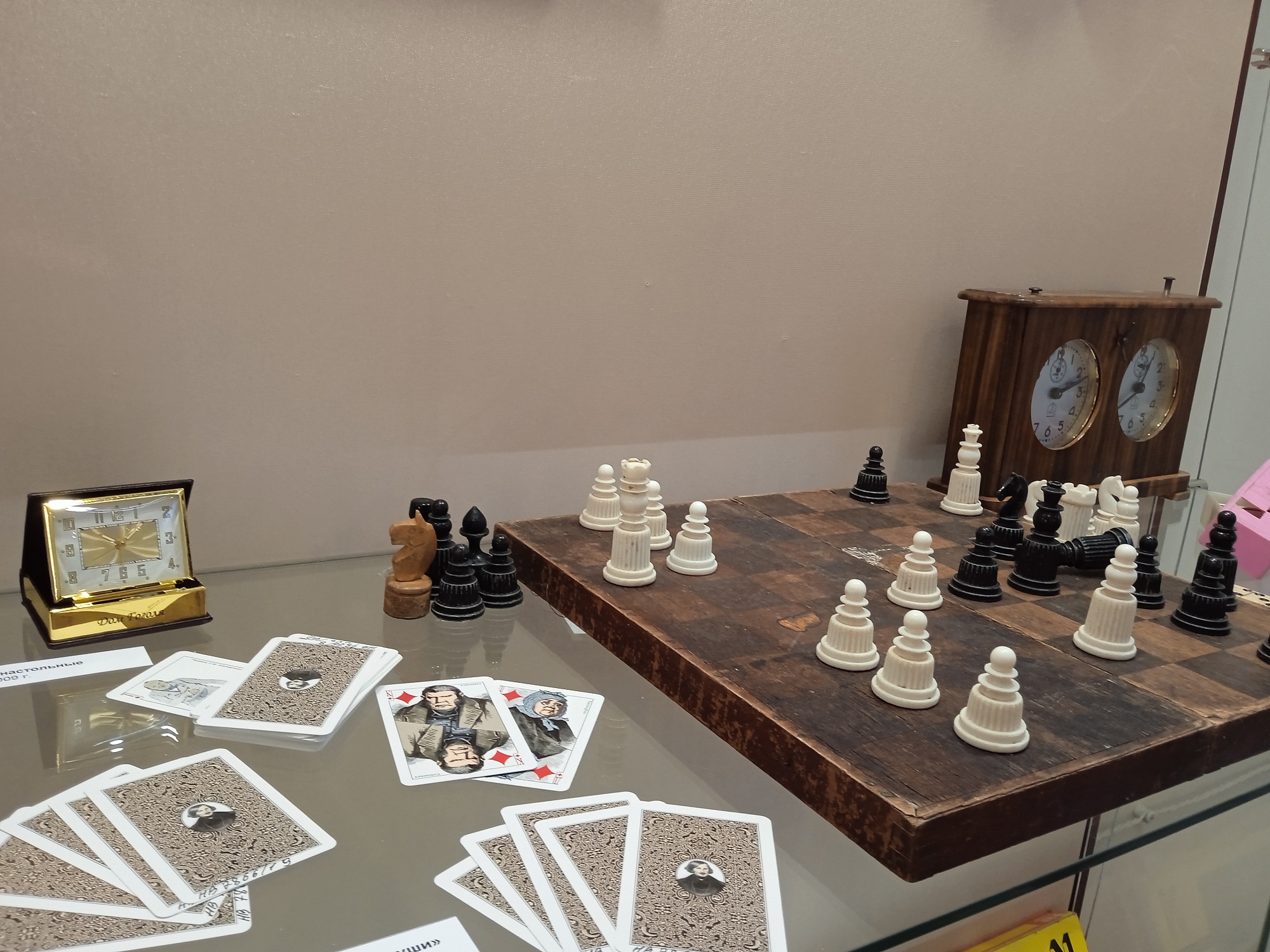 Отдельный блок выставки посвящен досугу и развлечениям, его составили игрушки и настольные игры советского времени. Кто-то с ностальгией вспомнит свое детство и развивающие интеллектуальные игры, шахматы, шашки. В витринах также можно увидеть приставку «Денди», игру «Ну, погоди», кассетный плеер.