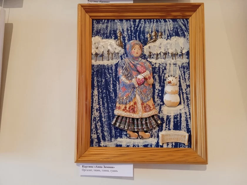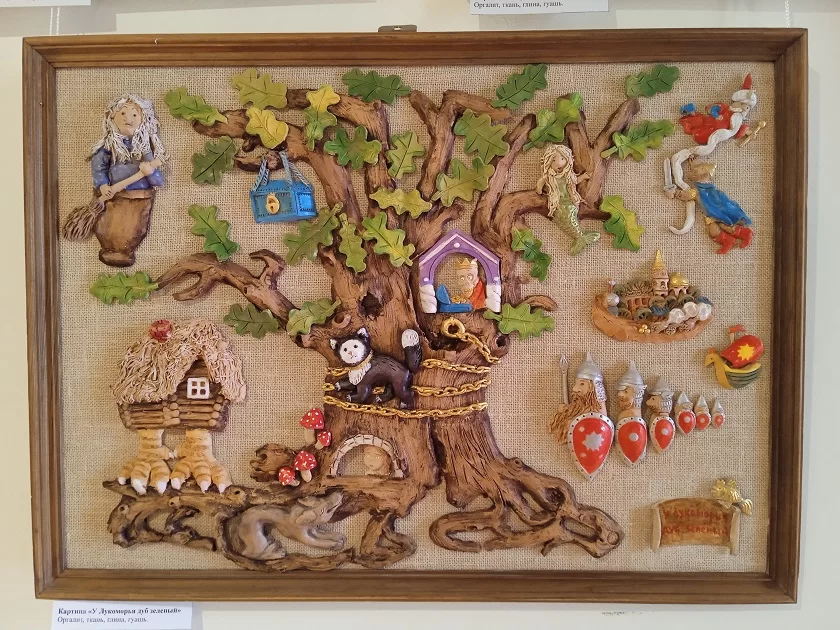 Интересны ее объемные картины из глины. Их сюжеты часто связаны с народными и религиозными праздниками. В год юбилея А. С. Пушкина не была обойдена сказочная тема – среди других в музее представлена композиция «У лукоморья дуб зеленый», которая погружает в атмосферу сказок великого русского поэта.