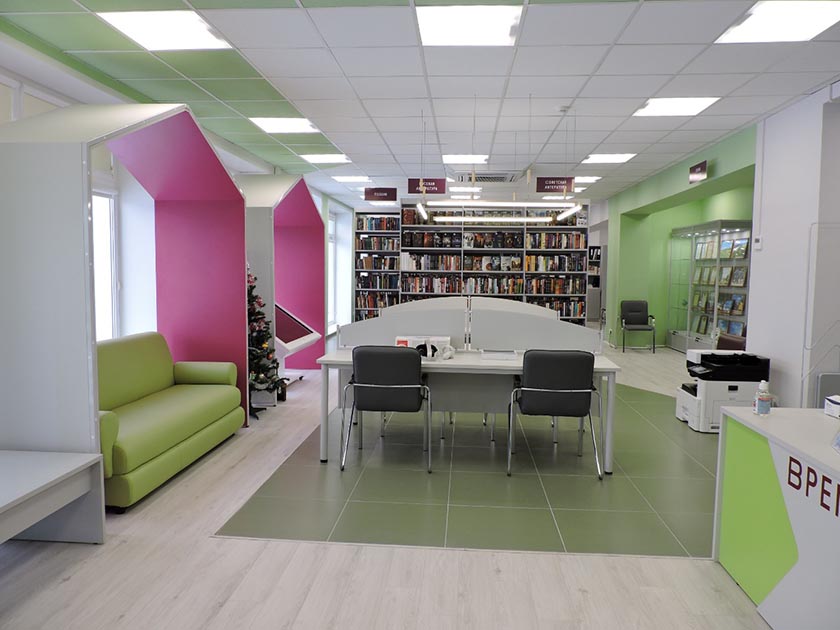 В обновленном пространстве создана мягкая зона для чтения, где можно удобно расположиться в креслах и на пуфах. Есть и релакс-площадки для молодёжи с интерактивными панелями и шлемами виртуальной реальности.