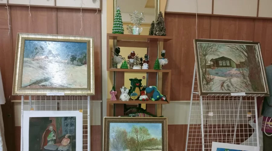 На выставке представлены рождественские рисунки, игрушки, сувениры, украшения.
