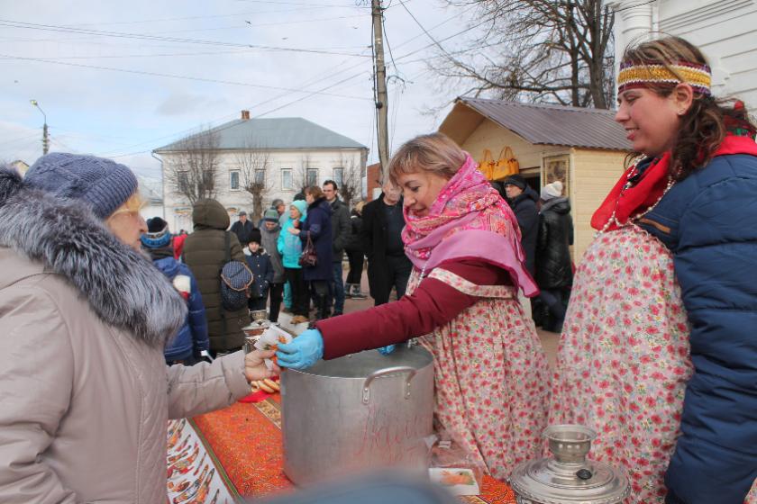 Чаем да блинами с яишенкой тарусян и гостей города потчевали члены Тарусского купеческого клуба, местного отделения всероссийского движения «Волонтеры Победы», предприниматели Тарусского района.