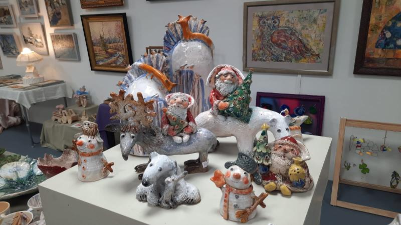 Тарусяне представляют лучшие свои произведения, выполненные в различных жанрах и техниках и желают всем гостям счастливого праздника. Здесь можно приобрести подарки на любой вкус и просто погрузиться в атмосферу Нового года и Рождества — по детски добрую и очень теплую.