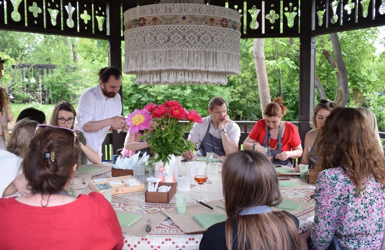 В уютной беседке прошёл мастер-класс по созданию мозаичного панно с пионами от преподавателей школы мозаики «Сад Гранат». Гости гуляли по Саду Ракицкого под музыку из старинного патефона и отдыхали в тенистых уголках. Евгения Жданова провела мастер-класс по сервировке с использованием посуды и декора от «Дома фарфора».