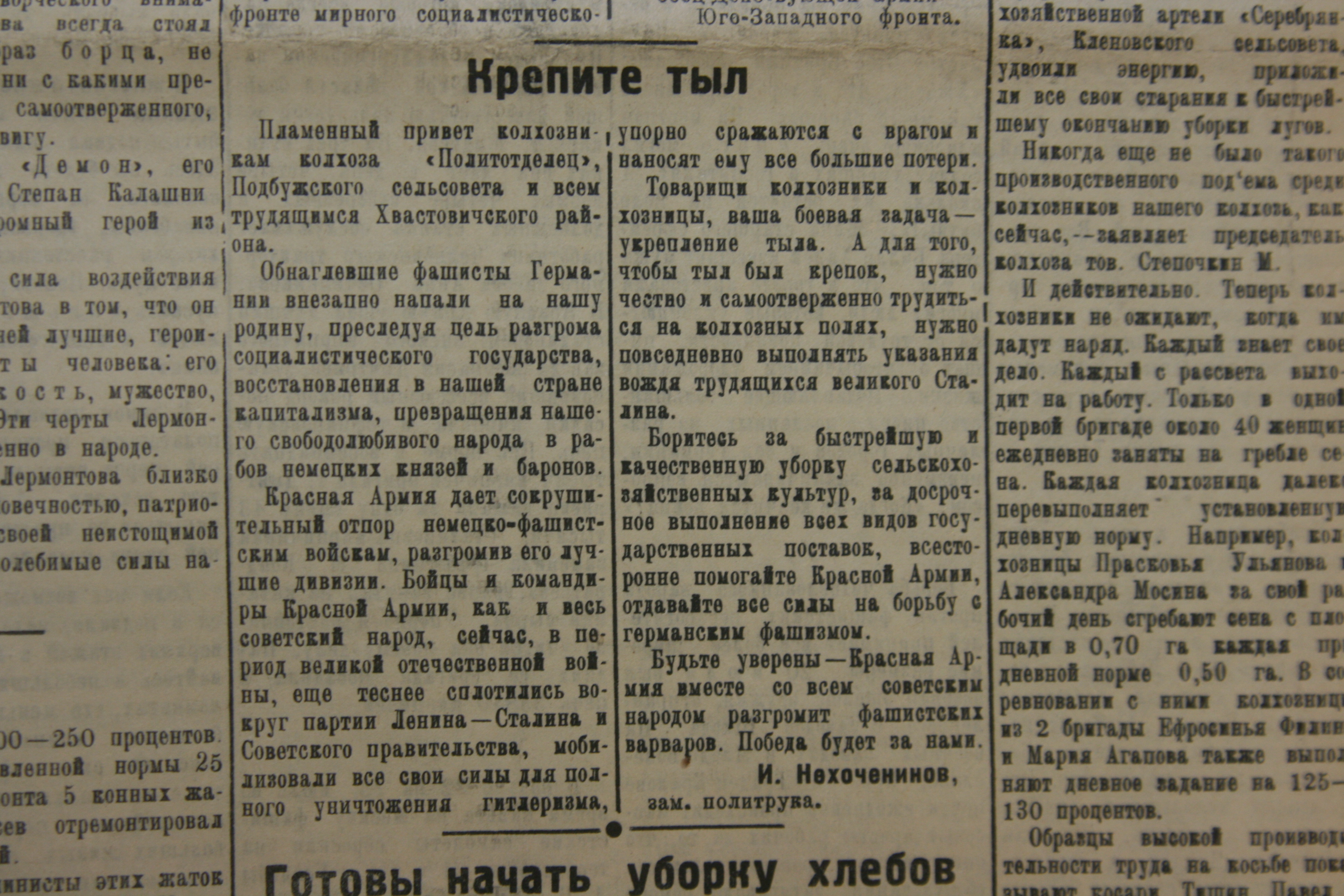 Боритесь за быстрейшую и качественную уборку сельскохозяйственных культур, за досрочное выполнение всех видов государственных поставок, всесторонне помогайте Красной армии, отдавайте все силы на борьбу с германским фашизмом.