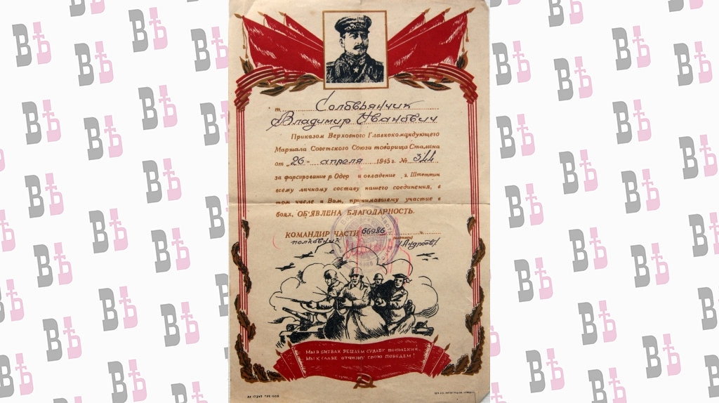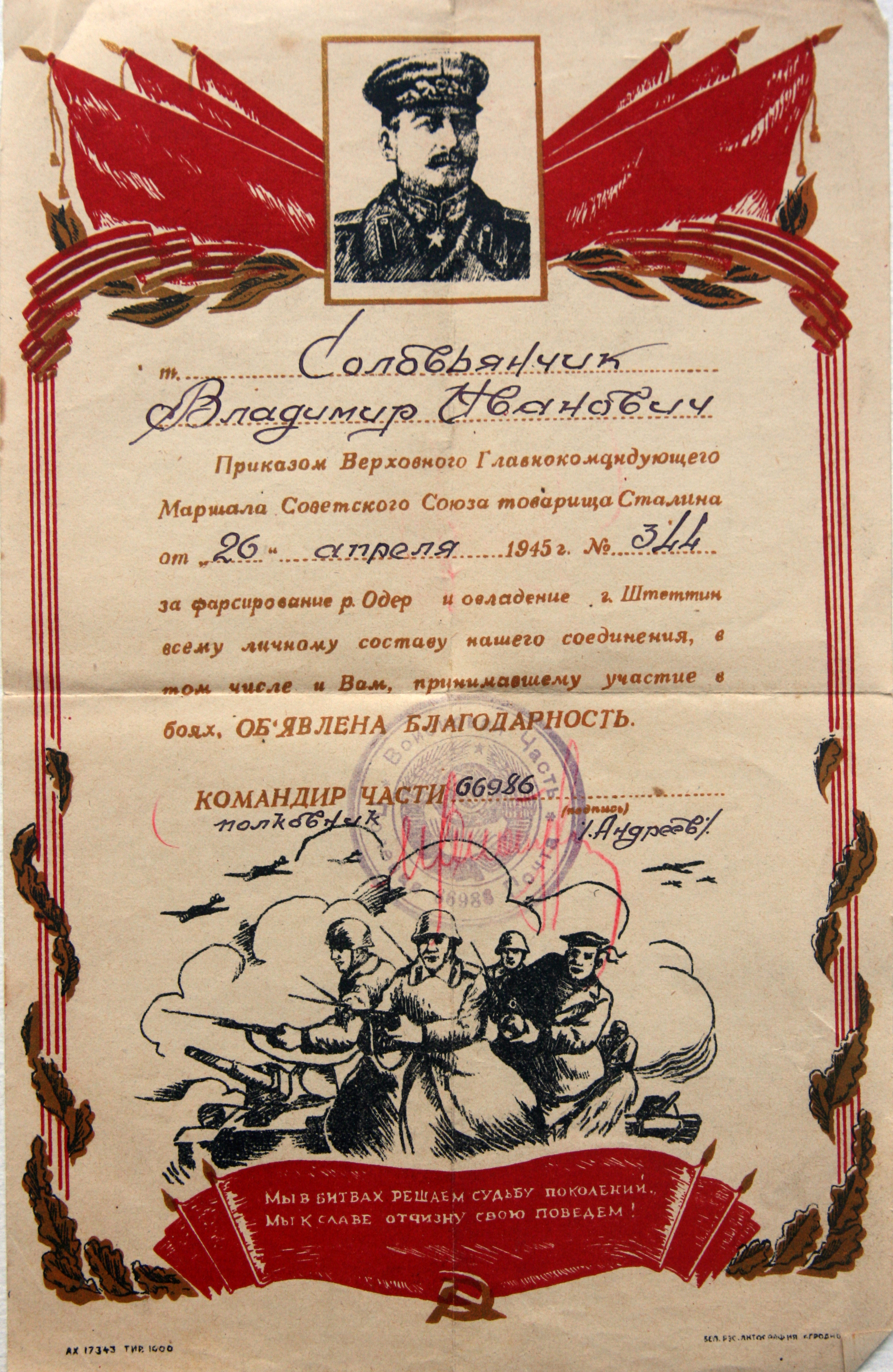 Эти документы передала в музей лицея № 9 Маргарита Владимировна Домбровская: удостоверения военного строителя, выданные Владимиру Соловьянчику, ее отцу, в том числе и то, которое было залито кровью, – сложенный вчетверо листок с блеклым машинописным текстом, фотографией и подписью командира; благодарность за форсирование Одера и овладение городом Штеттин, отпечатанную на отдельном бланке, который украшен портретом Сталина, красными знаменами, рисунком солдат, бегущих со штыками наперевес в атаку. Под ними на красном полотнище надпись: «Мы в битвах решаем судьбу поколений, мы к славе Отчизну свою поведем!». Позади этой группы – клубы дыма, силуэты танков, вверху – самолеты.