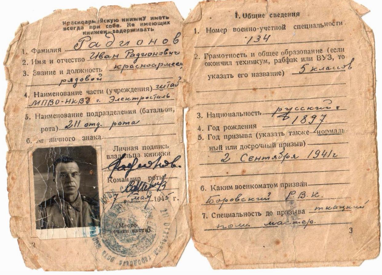 Война вошла 22 июня 1941 года огромной бедой в каждый дом. Не обошла стороной и нашу семью. Из рассказов взрослых я знаю, что на войне воевал мой прадед по отцовской линии Иван Родионович Родионов и родной брат моего деда Юрий Иванович Зуев. В семье как реликвия бережно хранится потёртая, пожелтевшая от времени красноармейская книжка прадеда. Это была для него уже третья война.