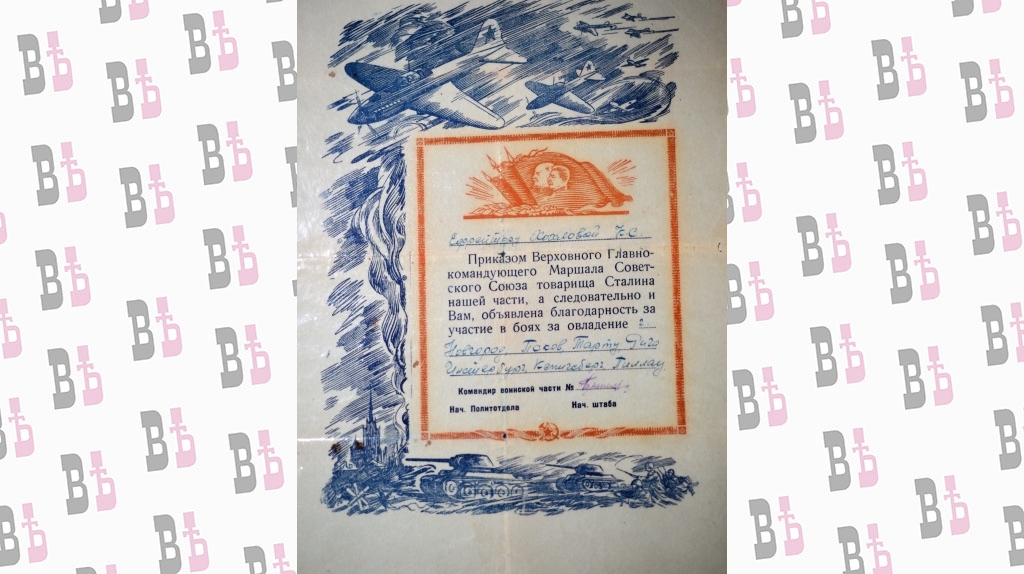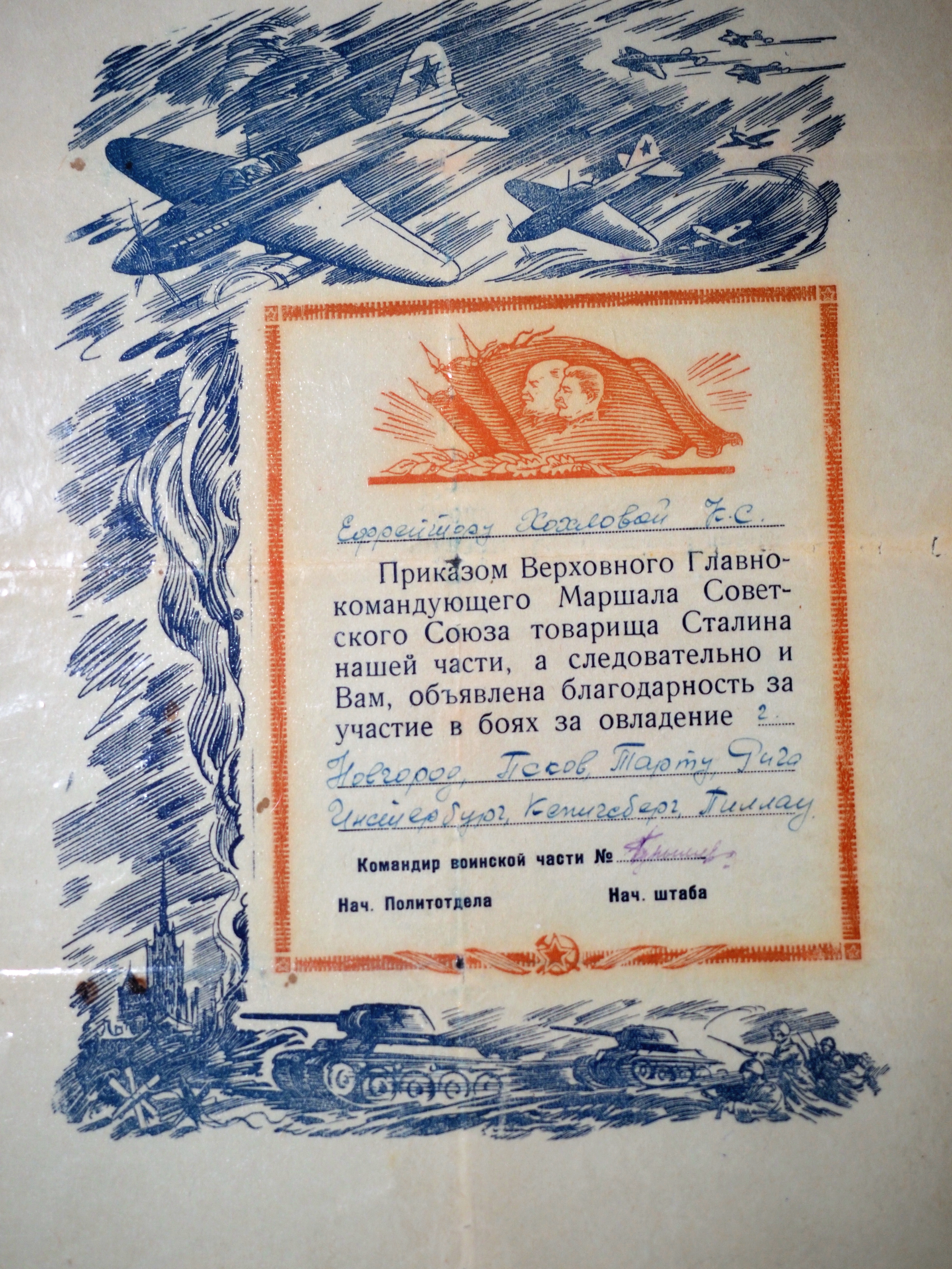 Сохранились в архиве Клавдии Сергеевны Митяевой (Хохловой) документы военного времени. Среди них книжка минера, куда записывали все обезвреженные боеприпасы, а также благодарности командования. А еще благодарность за участие в боях, в ходе которых были освобождены Псков, Новгород, Тарту, Рига, Кенигсберг, Инстербург, Пиллау (с 1946 года соответственно – Черняховск и Балтийск Калининградской области), и удостоверение к медали «За оборону Ленинграда». Она была вручена 31 декабря 1943 года. Новогодний подарок!