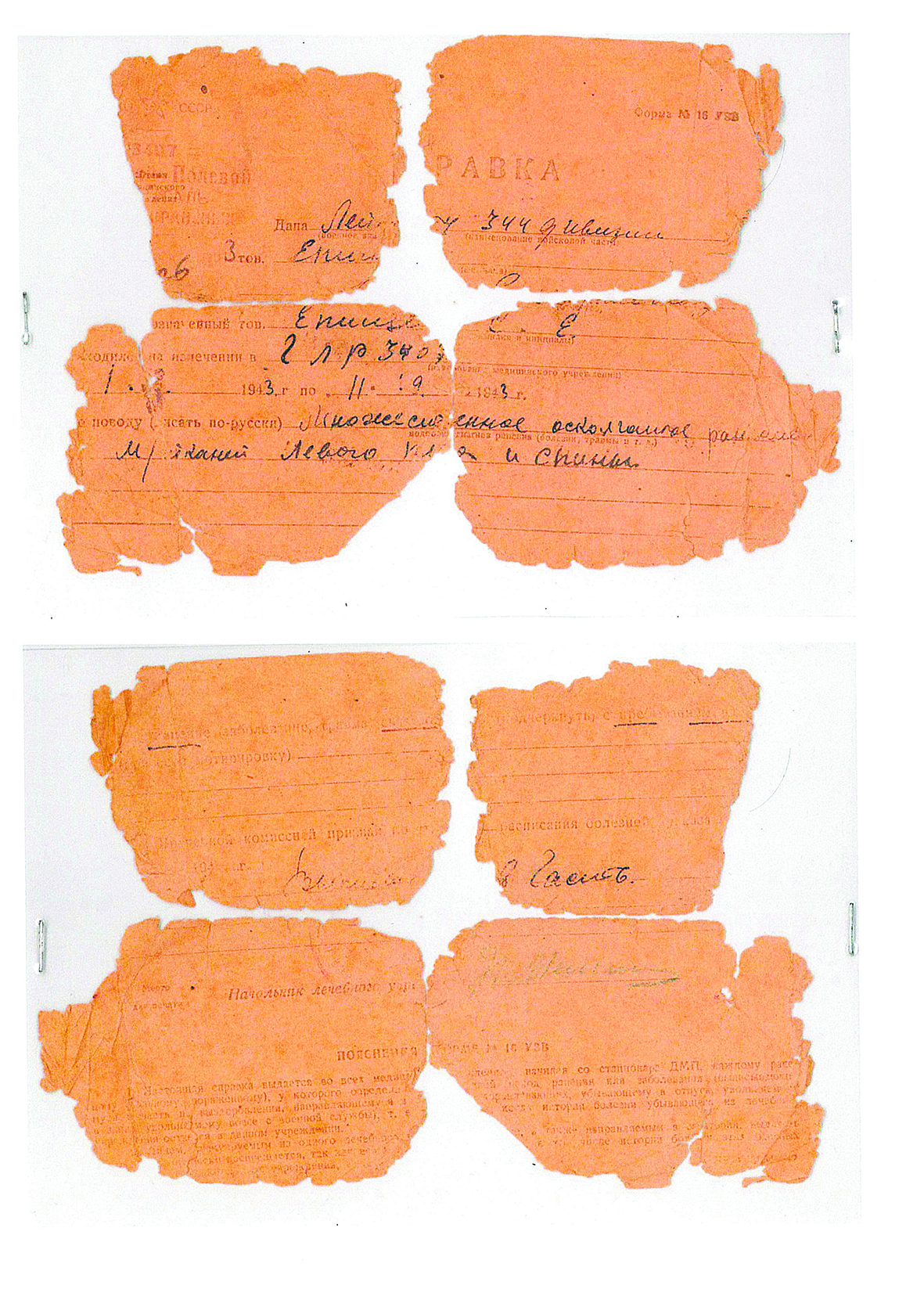 У каждого из моих родителей - своя фронтовая биография. Отец, Семен Ефремович Епищев, был призван в 1942 году и после подготовки на курсах в Калуге младшим лейтенантом направлен в 344-ю стрелковую дивизию 50-й армии Западного фронта, которая занимала оборону в районе Зайцевой Горы. Участвовал в боях за освобождение Смоленской области, командовал пулеметным взводом. Был несколько раз ранен. В семье сохранилась справка, выданная ему в госпитале. И хотя от времени она порвалась по сгибам, в одной из граф можно прочесть: «Множественное осколочное ранение мягких тканей левого плеча и спины», дата выписки – 11 сентября 1943 года. Другое ранение было тяжелей, врачи не смогли спасти отцу правую ногу. Свидетельство о болезни указывает дату ранения – 22 сентября того же 1943 года, то есть спустя без малого две недели после выписки из предыдущего госпиталя…