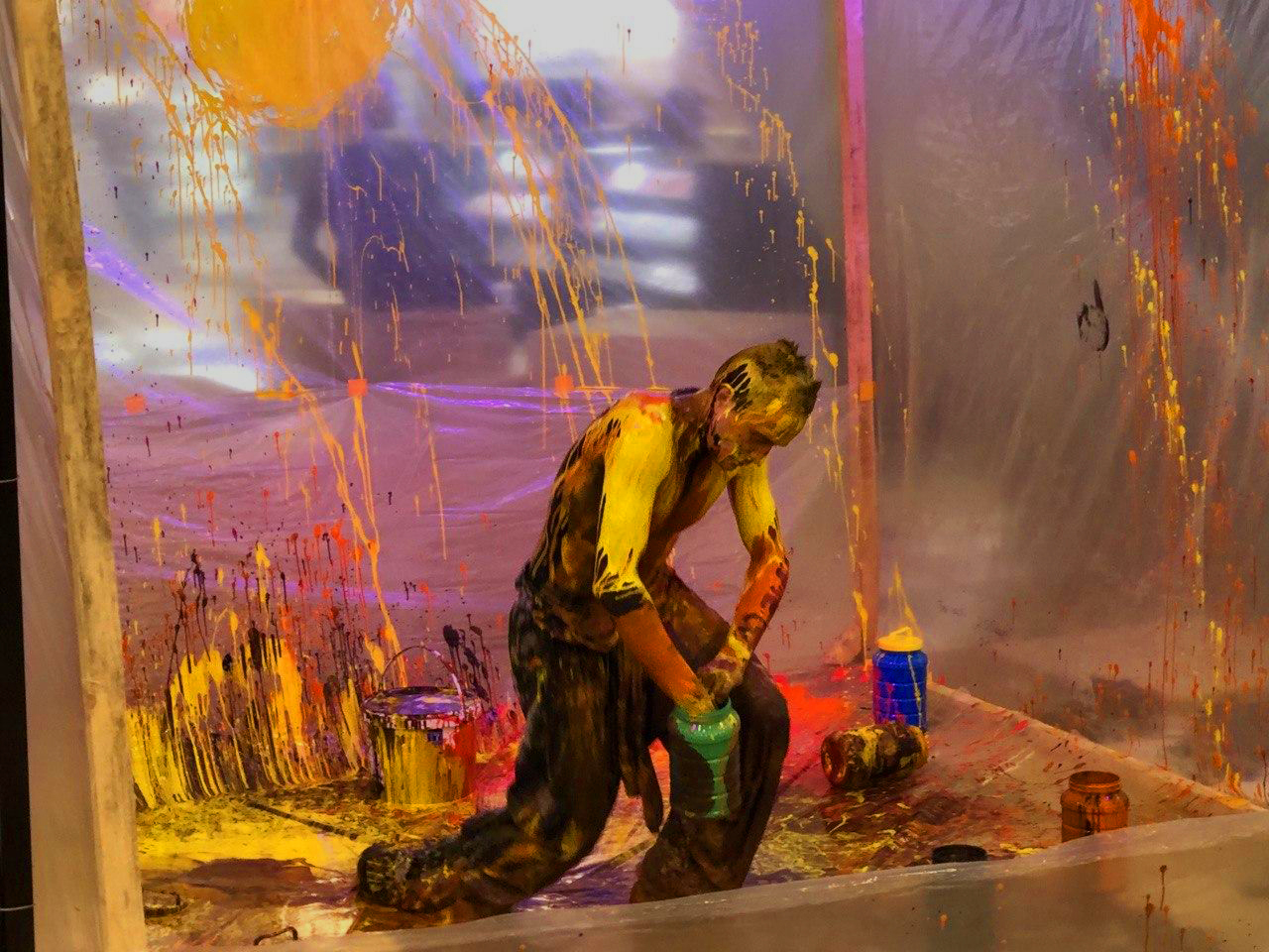 Спектакль подготовил руководитель проект-театра «Питерская театральная тусовка» Павел Михайлов. Он же сыграл в нем главную и единственную роль. Герой зачитывал подготовленный текст, написанный по теоретическим сочинениям Василия Кандинского и Казимира Малевича. После каждой главы он откладывал рукопись и под музыкальное сопровождение «Kota Records» обливал себя разными цветами краски. Каждый цвет что-то символизировал: синий — небо, зеленый — деревья и т.д. В наборе художника встретились черный, красный, оранжевый, желтый, зеленый, синий и белый цвета. К завершению своего выступления актер как будто пережил все радости и горести человеческой жизни, погрузился сам и погрузил всех окружающих в переживание чувств и эмоций. Именно эту цель преследовал проект — дать зрителю возможность созерцать и сопереживать.