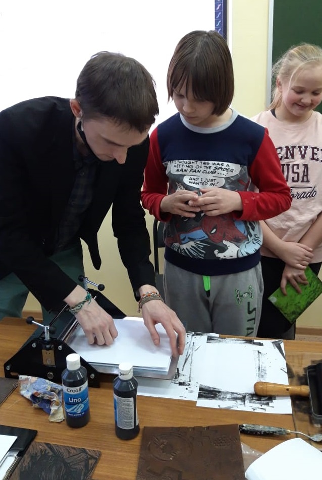 Из музея школьникам привезли станок, рассказали о его устройстве. Фактически, это линогравюра, потому что форма, с которой делалась печать, вырезана на профессиональном линолеуме. Ребята под руководством опытных наставников осваивали премудрости создания эстампа. Конечно, занятие заинтересовало юных исследователей, помогло не только узнать много нового, но и создать свои первые графические шедевры.