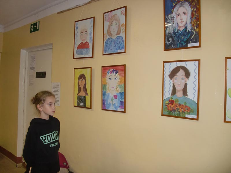 Помимо того, в фойе школы проходит выставка художественных работ учащихся, где они нарисовали портреты своих мам. Что интересно, на этих рисунках все мамочки получились очень похожими.