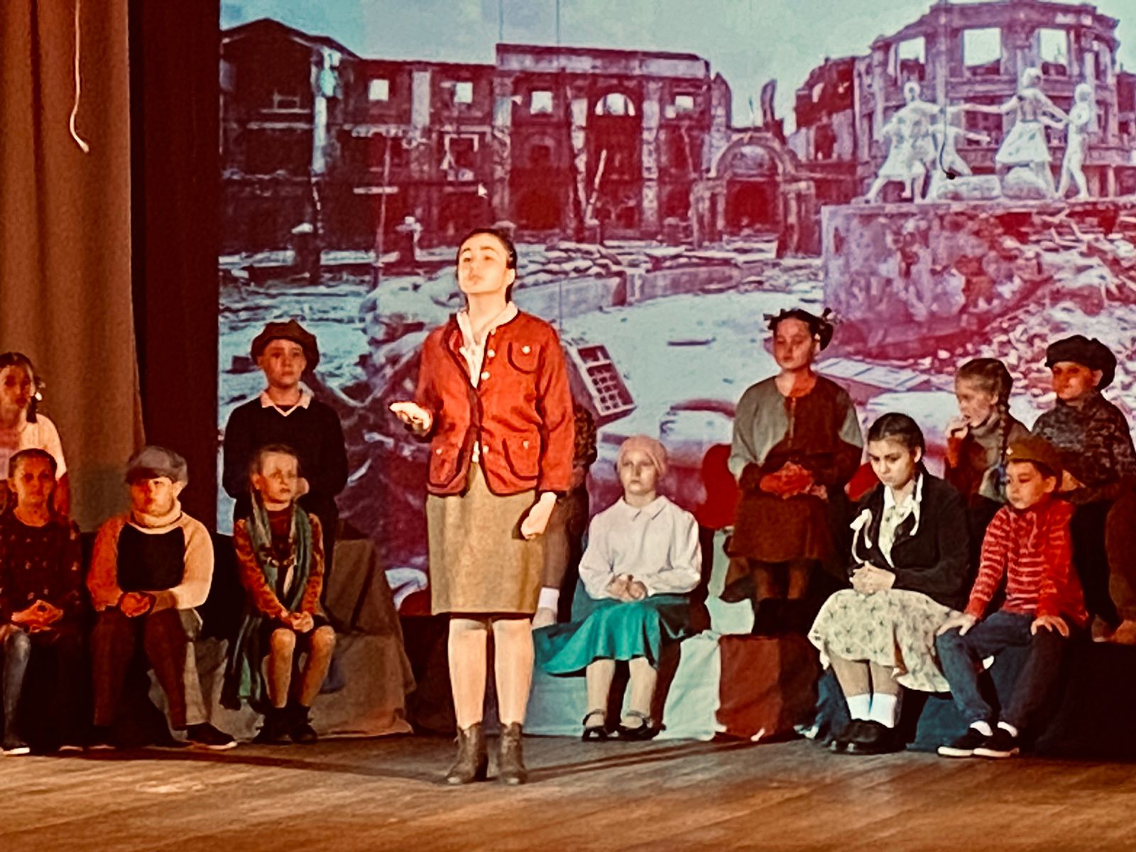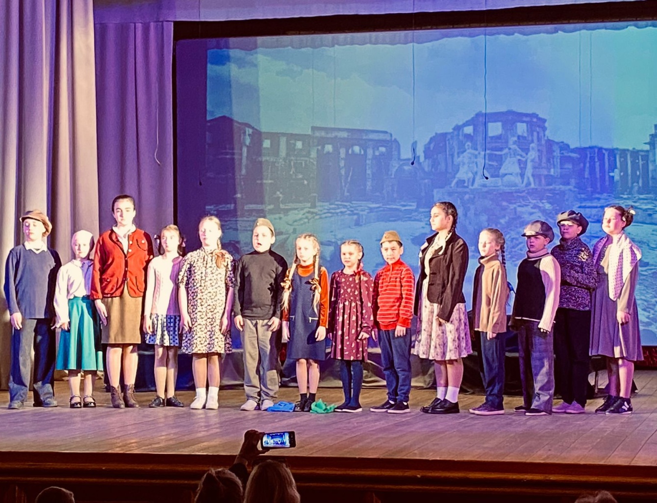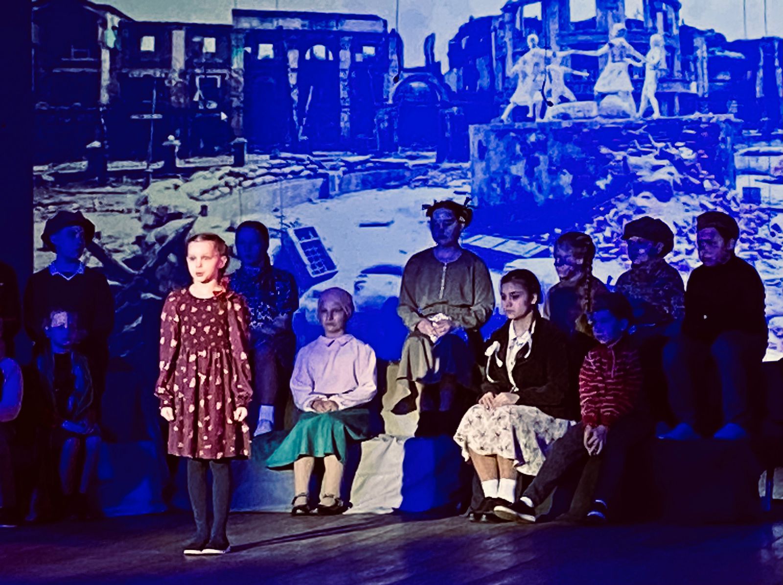 Под руководством режиссёра Елены Шлямневой юные актёры подготовили и исполнили стихи известных поэтов: Рождественского, Михалкова, Плецковского, Барто. Мальчишки и девчонки эмоционально и доходчиво донесли до зрителей то, как рано повзрослели их сверстники военной поры. Как много они хлебнули горя и сколько тягот вынесли на своих хрупких плечах. Рассказали, как дежурили в госпиталях, собирали урожай, выпускали боеприпасы, как ждали отцов. Как пришли в опустевшие цеха заводов и трудились в полях, заменив собой ушедших на войну взрослых. Как терпели голод и холод, вкладывая все свои маленькие силы в большое дело общей Победы над врагом.