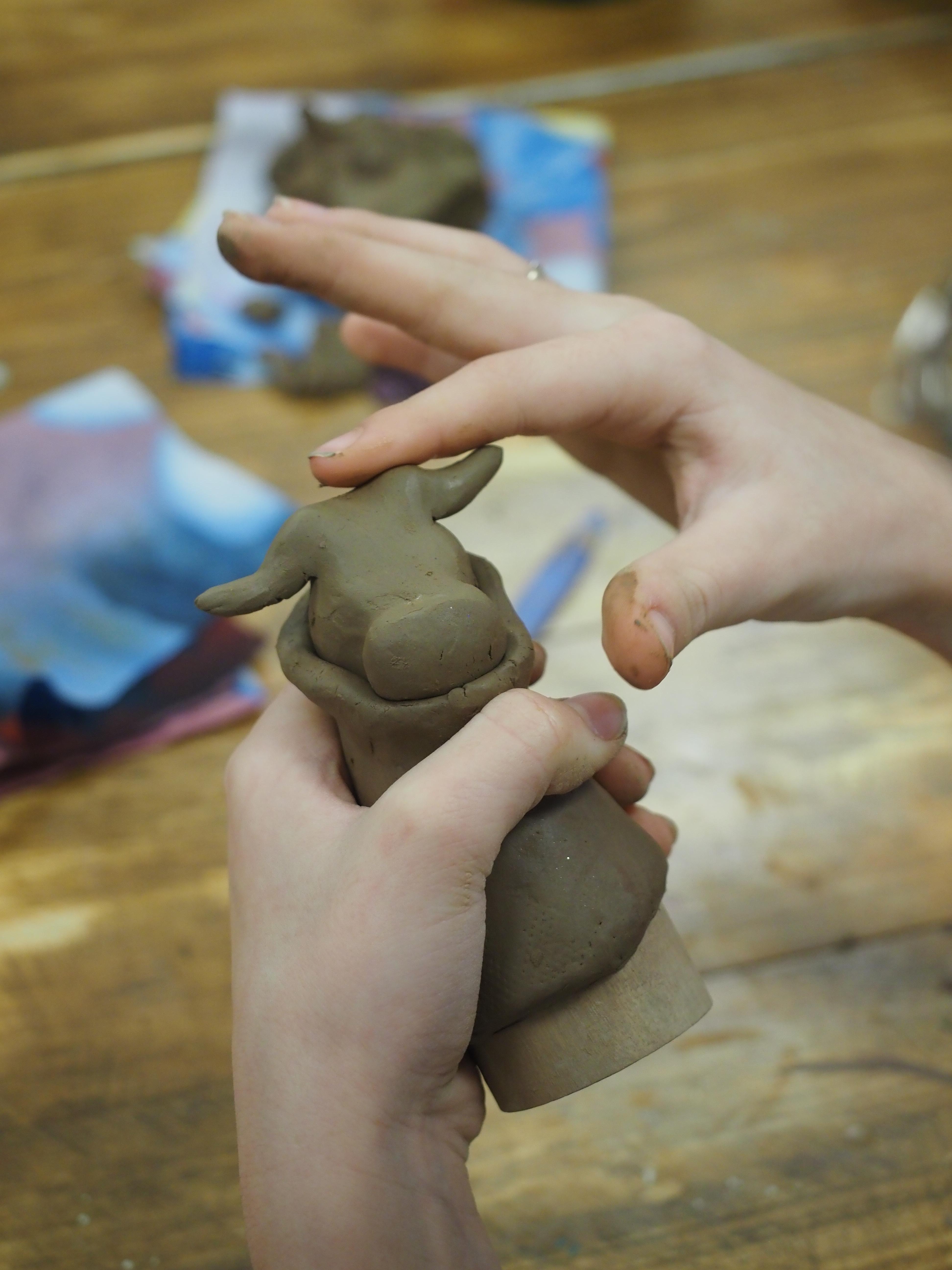 Мы в студии керамики Ерденевской средней школы. Занятия проводит педагог дополнительного образования Наталья Антонова. За столом - ученики 4, 5 и 6-х классов.- Капельку, небольшой шарик, сделали и в ладошке раздавливаем. Вика, смотри! Вот такие маленькие будут ушки. Какой бычок у тебя - не лопоухий, хитренький, наверное. Зато такой курносый, - подбадривает детей Наталья Михайловна.