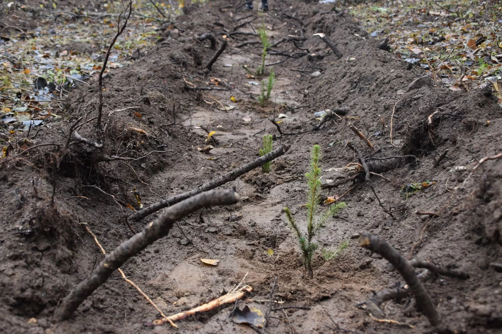 Затем в отличном настроении, под бодрящий музыку ребята взялись за дело: сажать под меч Колесова зелёные колючие маленькие ёлочки.