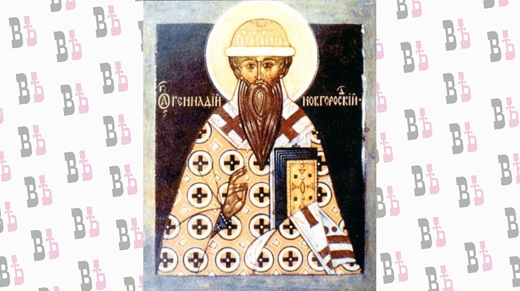 Святитель Геннадий, архиепископ Новгородский, происходил из рода Гонзовых и был, по свидетельству современников, "муж сановитый, умный, добродетельный и сведущий в Священном Писании". Первоначальное послушание проходил в Валаамской обители под духовным руководством преподобного Савватия Соловецкого (память 27 сентября). С 1472 года - архимандрит Чудова монастыря в Москве. Ревнитель строгого уставного Богослужения, в 1479-1481 годах архимандрит Геннадий вместе с Вассианом, архиепископом Ростовским, а затем с его преемником Иоасафом бесстрашно вставал на защиту древнего устава в возникшем споре о хождении "посолонь" при освещении нового храма. (Спор возник в связи с чином освящения Успенского собора в Москве.)
