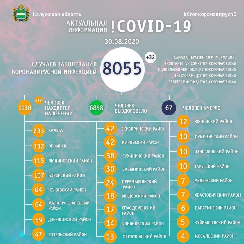 По состоянию на 30 августа всего в регионе было подтвержденоо 8055 подтверждённых случаев заболевания коронавирусом, из них 32 за последние сутки. Излечилось 6858 пациентов.