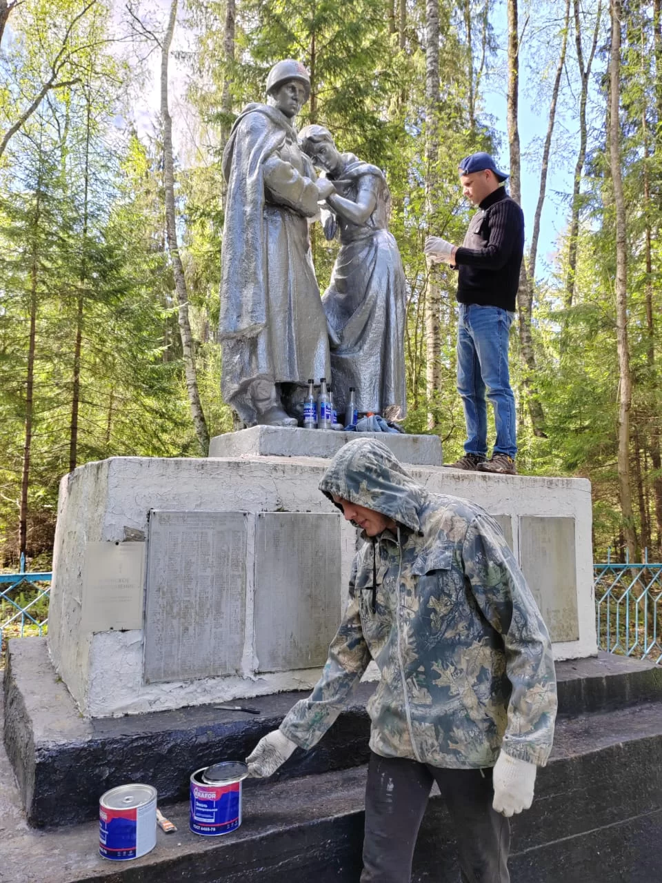Как обычно, фронт работы предстоял большой, так как захоронение находится глубоко в лесу. В процессе работы молодые люди убрали на огражденной территории опавшую листву и ветки, выскребли сухую траву. Очистили памятник от налипшей за зиму грязи, где необходимо, обновили потускневшую и облупившуюся краску.