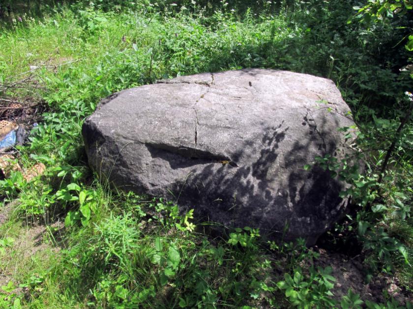 Меня камень тоже встретил приветливо, никак не напугав. Сам по себе он не выглядит особенным – валун из светлого гранита, явно принесенный ледником, не очень-то и большой. Не исключаю, что человек тоже приложил к нему руку – поверхность кажется слишком плоской и ровной. Похоже, что отколота и его небольшая часть. Неподалеку видна ямка - возможно, в ней действительно когда-то был еще один камень. Видно, что люди здесь бывают, устроен даже небольшой столик.