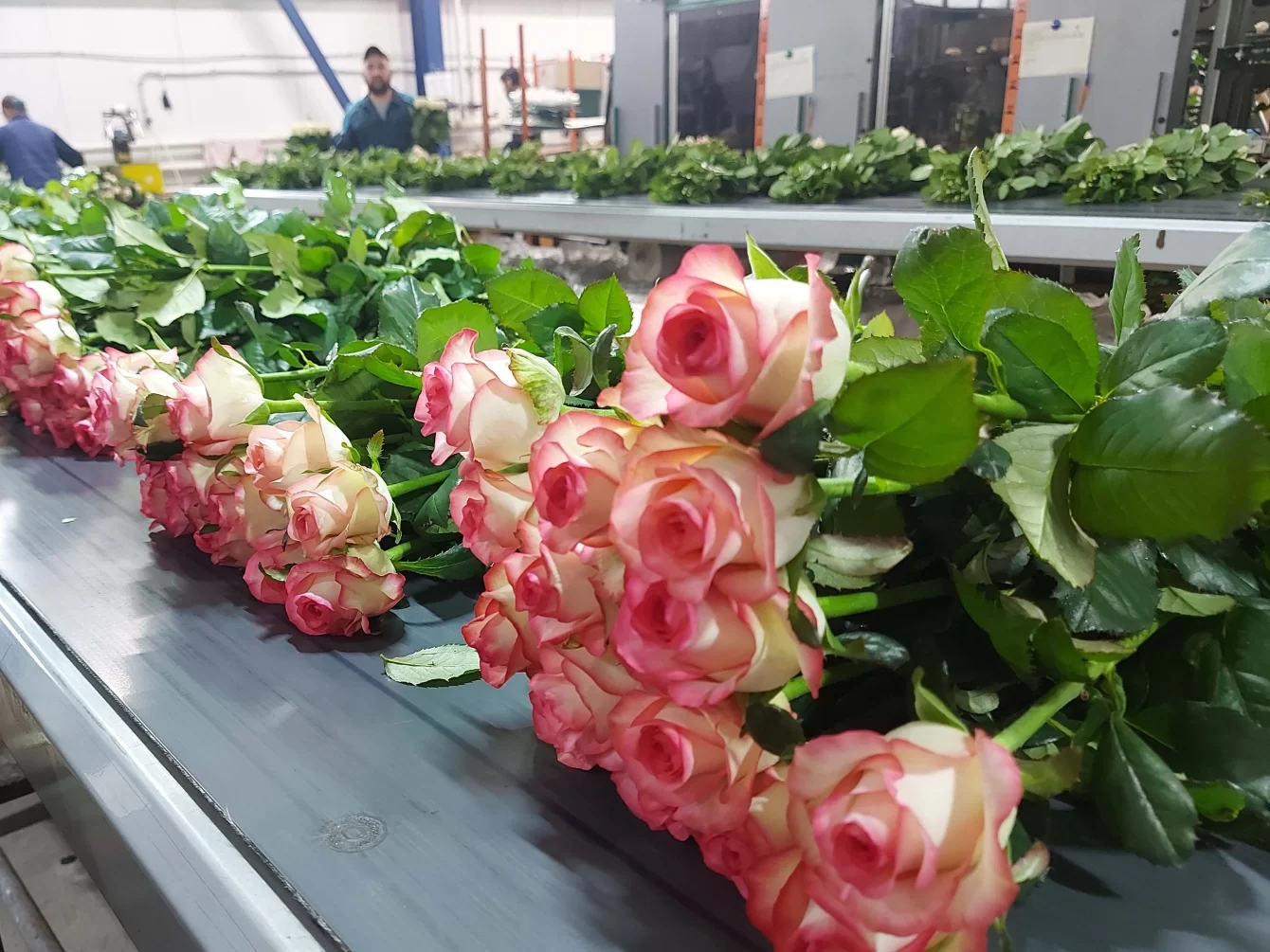 Оборудование для сортировки цветов было размещено на одной линии. Это позволило минимизировать скопление продукции, создать комфортные условия для сотрудников. Для сокращения количества повреждений при упаковке роз, были установлены вертикальные столы, а процесс перевязки был автоматизирован. Это позволило уменьшить брак в два раза.