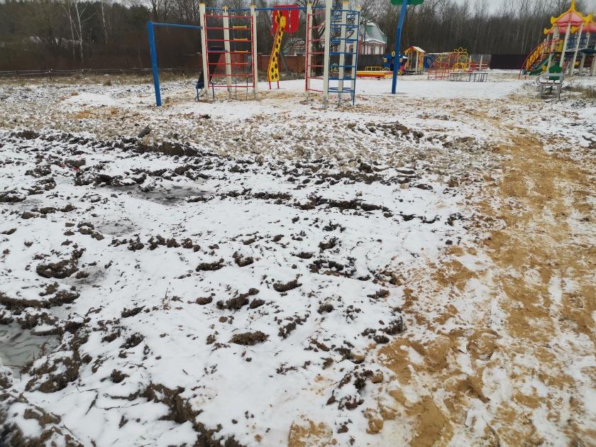 Основная претензия общественников была связана с отсутствием на детской площадке нормального покрытия. Они отметили, что на площадке разбросаны щебенка крупной фракции, камни, здесь же свалены опиленные ветви деревьев, а к территории примыкает разрушенный фундамент здания с бетонными блоками. В некоторых местах игровые объекты установлены на песчаной насыпи, отделенной от остальной территории провалами. Борта песочницы не примыкают к земле. При плюсовой температуре часть покрытия превращается в грязевое месиво.