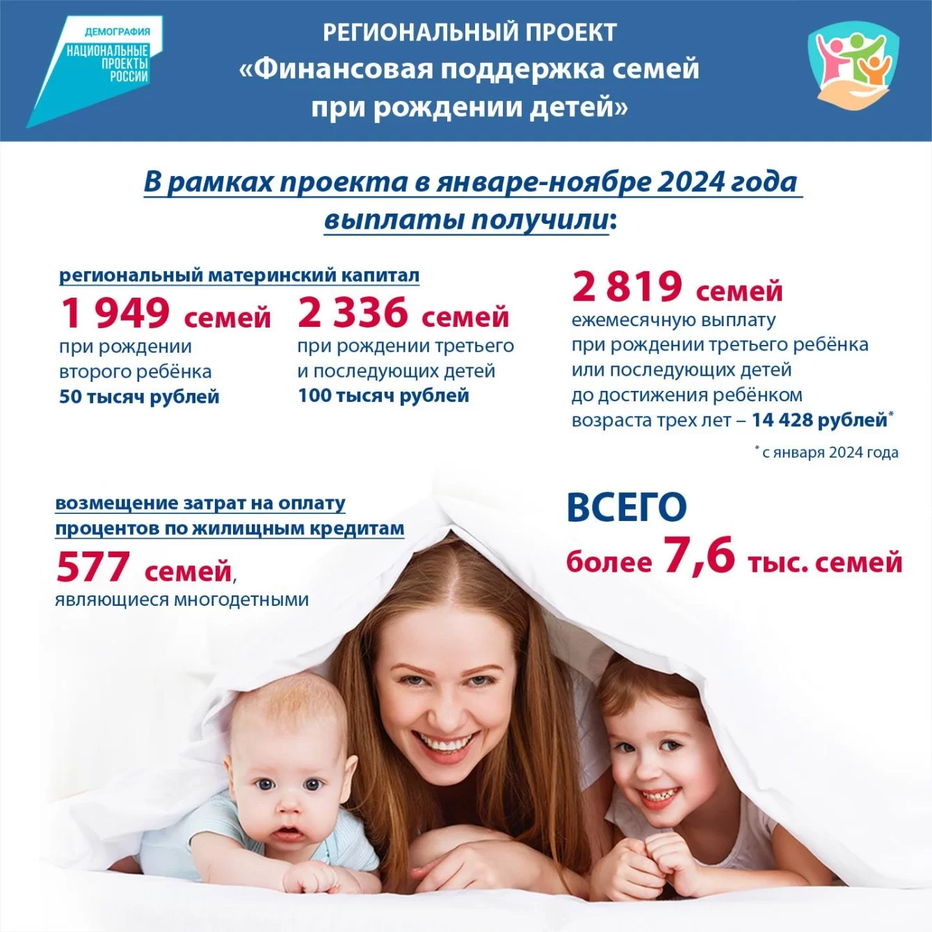«В 2024 году завершается реализация национального проекта «Демография», но работа, направленная на финансовую поддержку семей с детьми, не прекращается. Самые эффективные мероприятия войдут в новый национальный проект «Семья», и работа будет продолжена»,