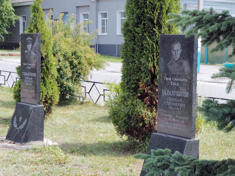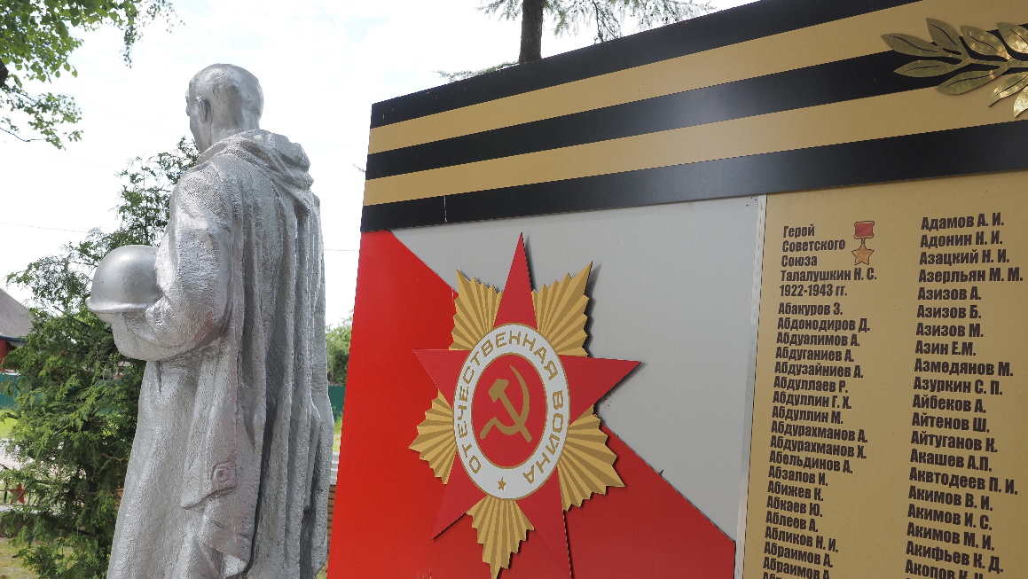 Марина Мосичкина показывает нам главные достопримечательности села. Останавливаемся у памятника, посвященного землякам, погибшим на фронтах Великой Отечественной войны. Здесь начинается аллея Славы, открытая в 2009 году. На одной из стел выбито имя Героя Советского Союза Николая Талалушкина.Осматриваем воинский мемориал, открытый в 1955 году. Сердце обливается кровью – в братской могиле покоятся останки почти 4,5 тысяч бойцов и командиров, а также партизан, павших за освобождение района. Это одно из самых больших братских захоронений на территории области. И список ежегодно растет. В прошлом году поисковики захоронили здесь останки нескольких красноармейцев. Имя Николая Талалушкина выбито вверху на одной из стел.