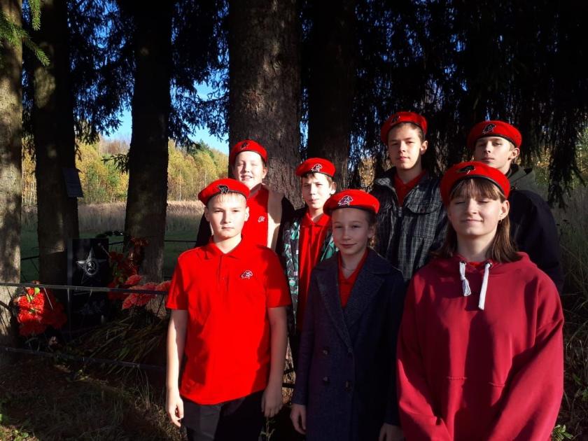 В продолжение поездки в Устиновку юнармейцы посетили и привели в порядок могилу неизвестного солдата, убрали сорняки и листву, выровняли почву и возложили цветы.