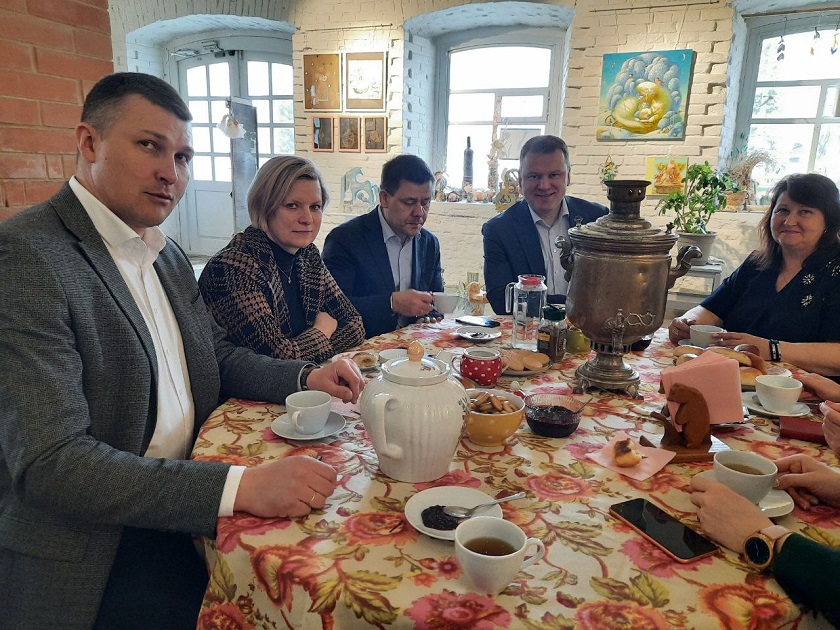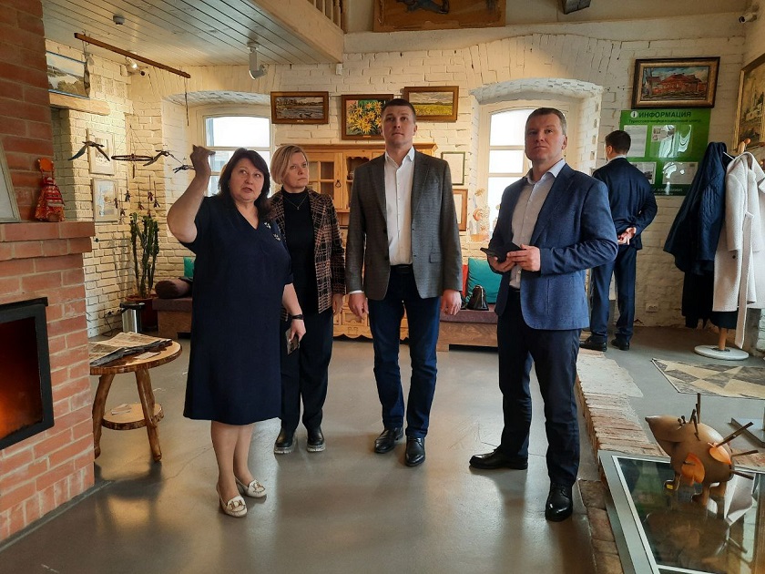 Врио главы администрации Михаил Голубев пригласил гостей посетить Туристско-информационный центр Тарусы, который сам по себе уже является достопримечательностью. Помимо старинной кирпичной кладки и сохранившихся балок перекрытий, настоящего камина, здесь представлены работы известных тарусских мастеров – художников, гончаров, ремесленников, вышивальщиц.
