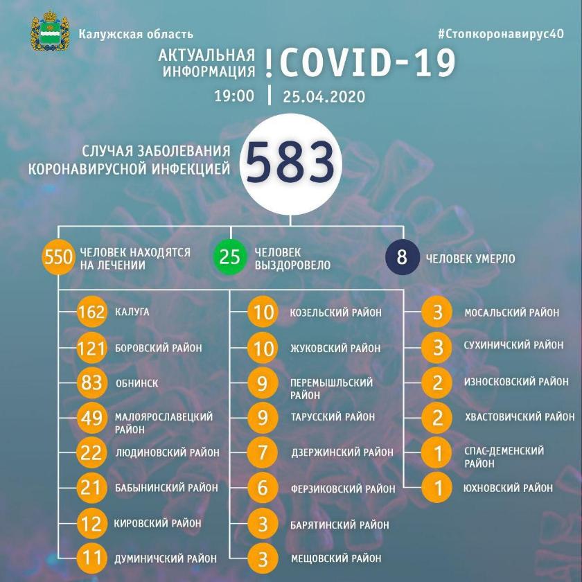 Как и сегодня утром, в регионе числится 550 заболевших из Калуги, Обнинска и 22 муниципальных районов.