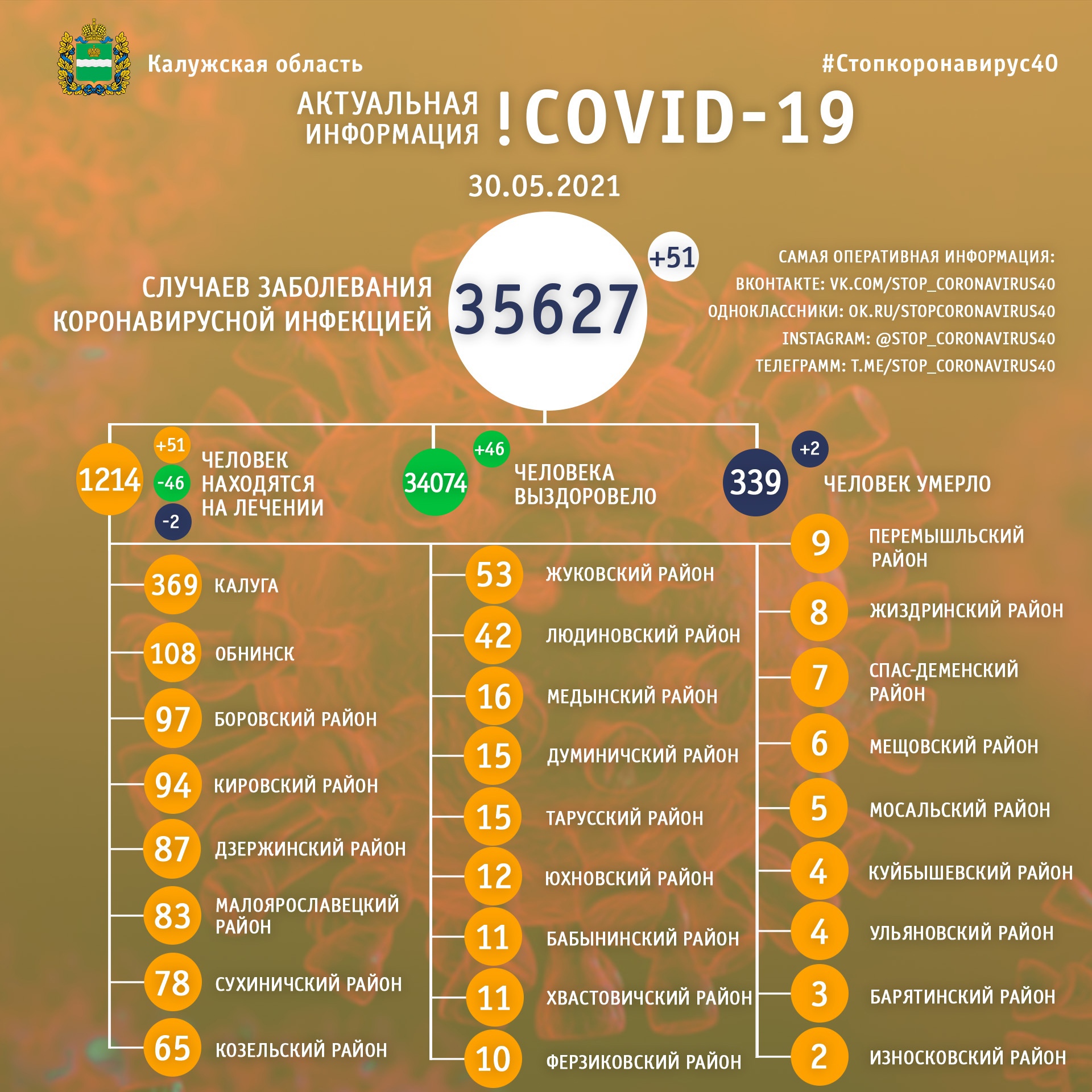 Оперштаб Калужской области опубликовал данные о ситуации с распространением коронавируса в региона по состоянию на 20 мая.