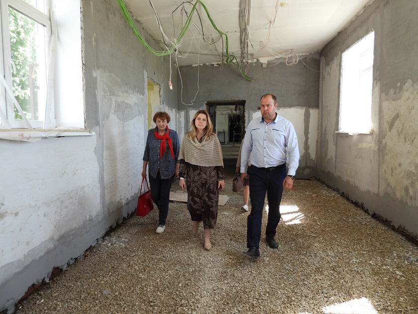 Ольга Коробова встретилась и пообщалась с представителями администрации района, директором школы и подрядчиком, который занимается ремонтом. Осмотрела помещение учебного заведения, где сейчас активно ведется демонтаж стен и потолков, частично отремонтированы классные комнаты, спортивный и актовый залы, столовая.