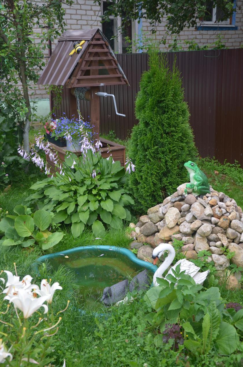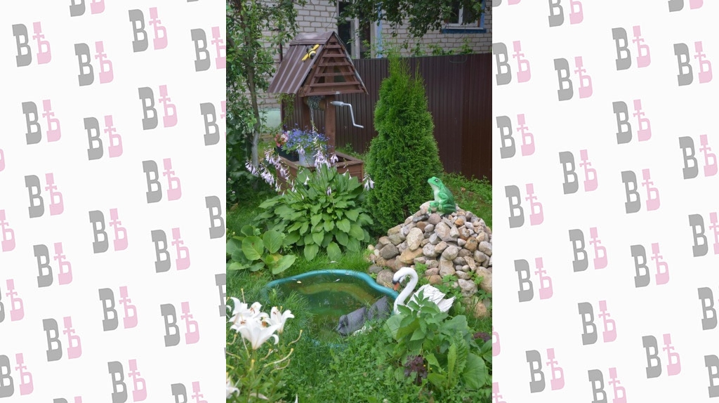 Уже возле дома Ирины и Владимира мы поняли: у хозяев точно нет проблем с выдумкой и фантазией. На лавочке сидит такая забавная старушка, что поневоле вздрагиваешь: уж больно смахивает на настоящую. И только подойдя ближе, понимаешь: искусно сделанная кукла. Улыбаясь, открыли калитку и попали… нет, не в Нарнию, а, скорее, в райский сад, где благоухало невероятное количество ярких цветов. Такое буйство красок впечатляет. Хозяйка провела нас по территории. Здесь помимо овощника, теплиц, клумб, добротных хозпостроек много садовых статуэток, импровизированных зон отдыха. В небольшом прудике шустро носятся рыбки и важно гребет лапками небольшая черепашка. Сын Бескрыловых, шестилетний Арсений, тут же доложил: