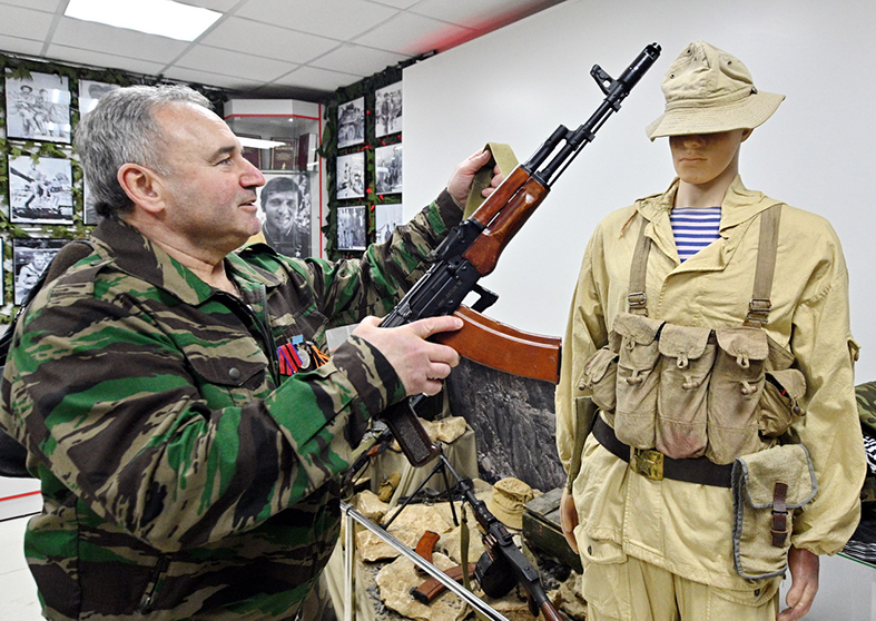 – Автомат у меня был вот этот – АКС (автомат Калашникова со складным прикладом. – Авт.). За сиденье можно положить. Еще вот такую сумку брал с собой – в ней магазины с патронами, спарка от пулемета перемотана изолентой, чтобы перезаряжать и больший объем патронов был, гранаты, – показывает Сергей Викторович макеты оружия из музейной экспозиции.