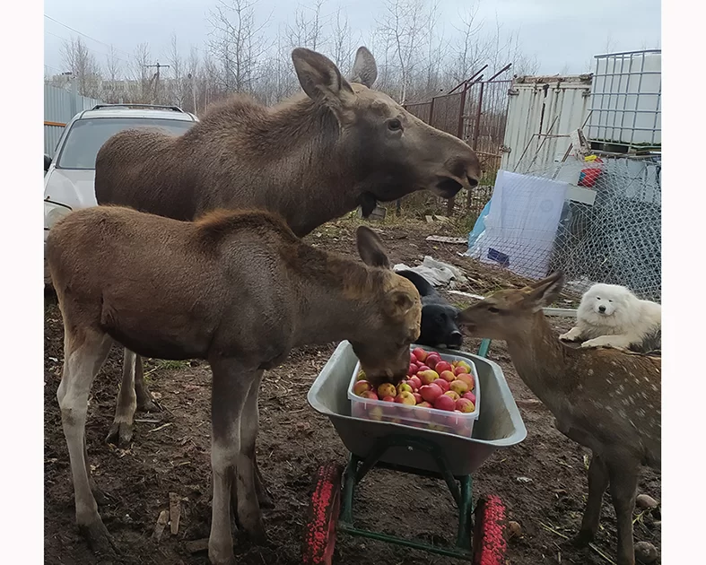 Сразу за воротами Веронику атакуют три «чекупиллы»: два лосенка и олененок проверяют содержимое тележки и, оттеснив всех, начинают хрустеть яблоками. Четвертым пристраивается пес Блэк. Яблоки ему не нужны: он внимательно наблюдает, как пережевывает еду олененок Олли, над которым Блэк давно уже взял шефство: присматривает, учит, играет.