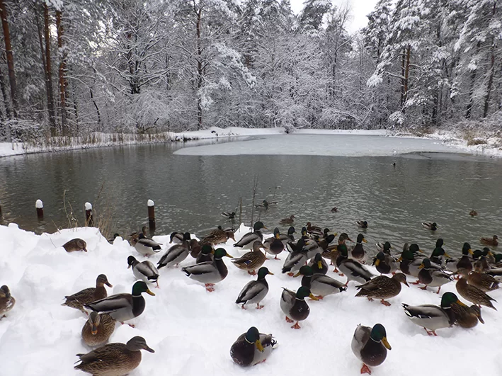 - Утки прекрасно летают. Каждый день перемещаются между водоемами. Проблем с ожирением у них нет. Они себя прекрасно чувствуют, что видно по их красивому блестящему оперению. Только не надо излишне их кормить. Незамерзающих участков водоемов, где они могут найти себе пищу, хватает. Если кормите, то крошите булку на мелкие кусочки, также подойдут корм для птиц из зоомагазина, зерно – овес, пшеница, ячмень, овощи, комбикорм. Делать это лучше там, где есть вода, а не бросать на снег. Вижу, что для многих людей утки – отдушина, радость от общения с природой. Последние 3-4 года настоящая революция с утками случилась - практически ручными стали. Раньше побаивались человека, а теперь некоторые прямо из рук едят.