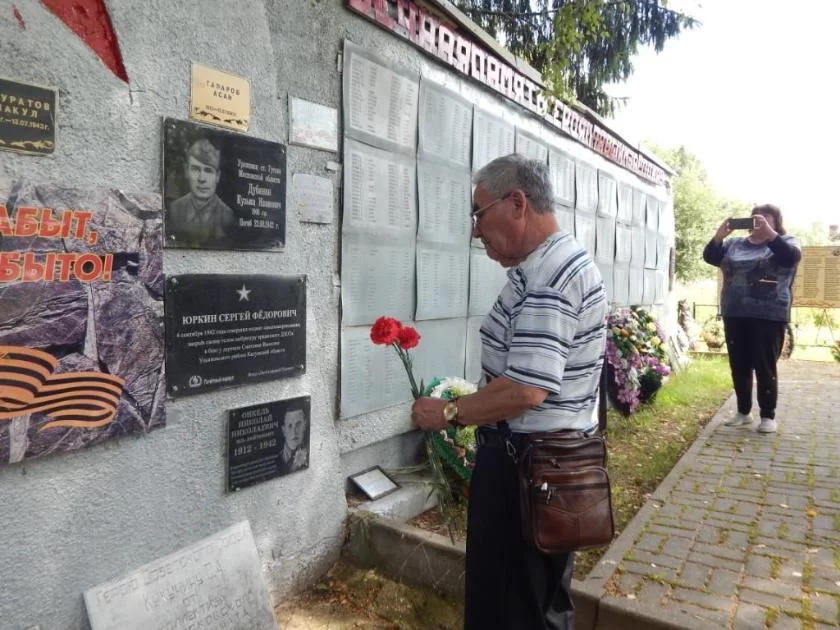 Красные гвоздики - дань памяти и уважения.JPG Во второй раз он приехал поклониться праху отца в 2018 году. А недавно, 4 августа, Женис Бердыгулович снова посетил район - встретился с директором районного краеведческого музея Геннадием Азаровым и посетил воинское захоронение в Ефимцеве, куда приехал в сопровождении главы администрации сельского поселения «Село Волосово-Дудино» Александры Фирсовой. Гость отметил, что за несколько лет территория воинского захоронения стала более благоустроенной.