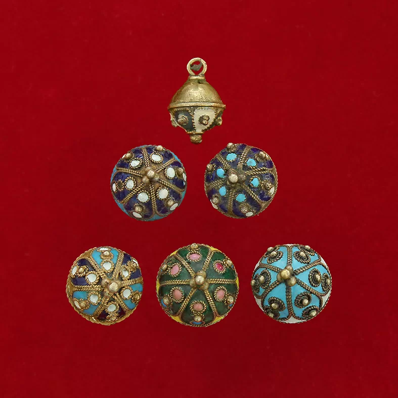 Очень красивы биконические граненые пуговицы, выполненные в технике выемчатой эмали. Судя по археологическим находкам, техника эта существовала как минимум в IX веке. Непрозрачные эмали создают мозаику насыщенных синих, голубых, белых, желтых и зеленых тонов.