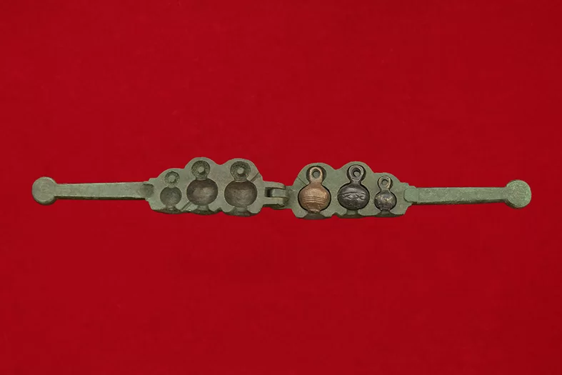 Значительную часть коллекции составляют литые пуговицы из медных и оловянисто-свинцовых сплавов с гравированным геометрическим орнаментом, так называемые гирьки. Наиболее характерные образцы такого орнамента – круг и концентрически расходящиеся окружности, гексаграмма, пентаграмма, квадрат, треугольник, трилистник и сочетания точек. Символы эти уходят корнями в глубокую древность и у разных народов трактуются одинаково: огонь, солнце, жизнь, земля.