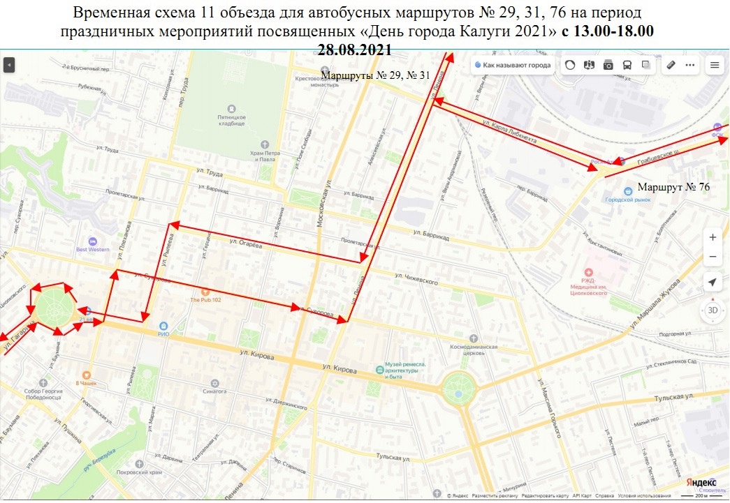 - маршруты №№ 29, 31, 76 будут осуществлять движение в объезд закрываемых участков через ул.Ленина-ул.Огарева-ул.Рылеева-ул.Кирова (обр.ул.Плеханова-ул.Суворова).