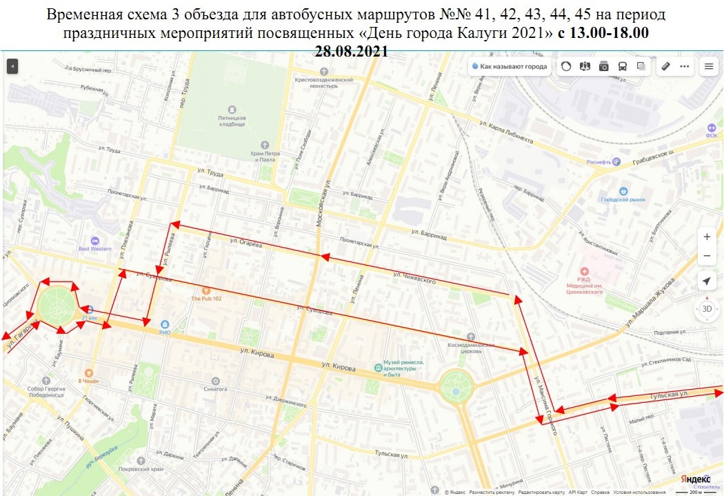 - маршруты №№ 41, 42, 43, 44, 45 буду осуществлять движение в объезд закрываемых участков по ул.Тульская-ул.М.Горького-ул.Чижевского-ул.Огарева (обр.ул.Суворова)-ул.Рылеева-ул.Кирова;