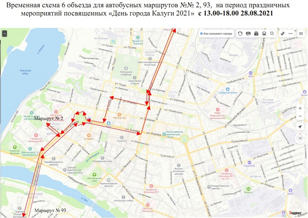 - маршруты №№ 2, 93, будут осуществлять движение в объезд закрываемых участков через ул.Московская-ул.Чижеского-ул.Рылеева (с 17.00 движение маршрута № 2 будет осуществляться через Дом Быта);
