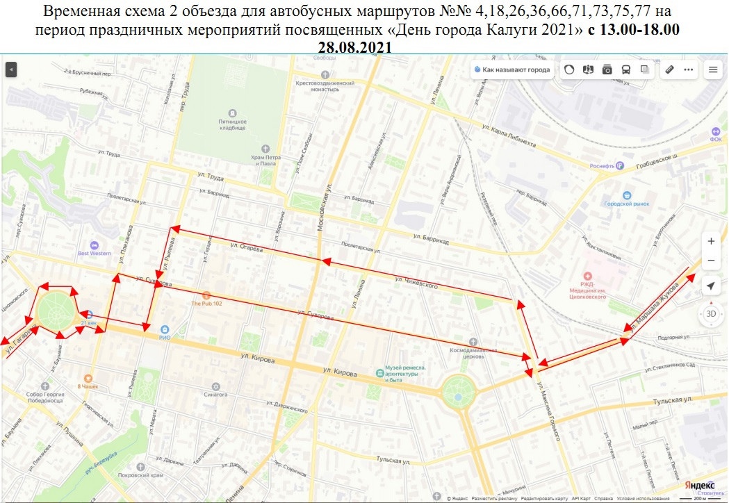 - маршруты №№ 4, 18, 26, 36, 66, 71, 73, 75, 77 будут осуществлять движение в объезд закрываемых участков по ул.М.Горького-ул.Чижевского-ул.Огарева (обр.ул.Суворова)-ул.Рылеева-ул.Кирова;