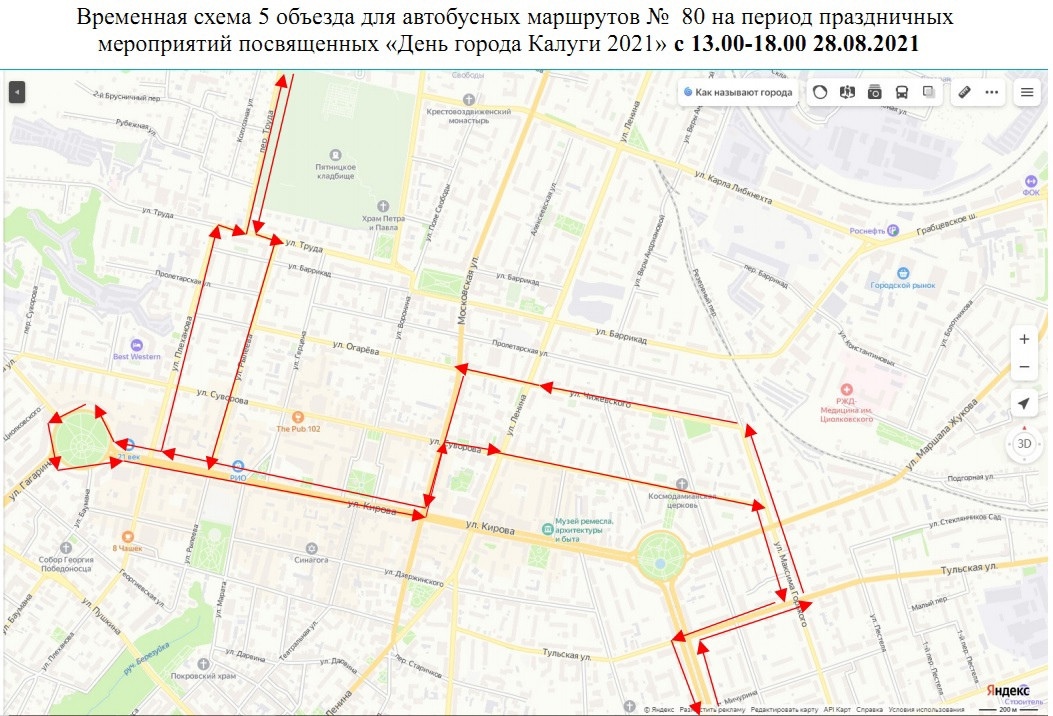 - маршрут № 80 будет осуществлять движение в объезд закрываемых участков по ул.Тульская-ул.М.Горького-ул.Чижевского-ул.Кирова (обр. ул.Московская-ул.Суворова-ул.М.Горького);