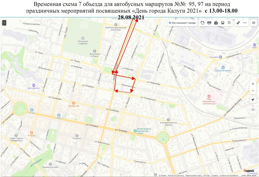 - маршруты №№ 95, 97 будут осуществлять движение в объезд закрываемых участков через ул.Московская-ул.Баррикад-ул.Ленина-ул.Чижеского-ул.Московская;