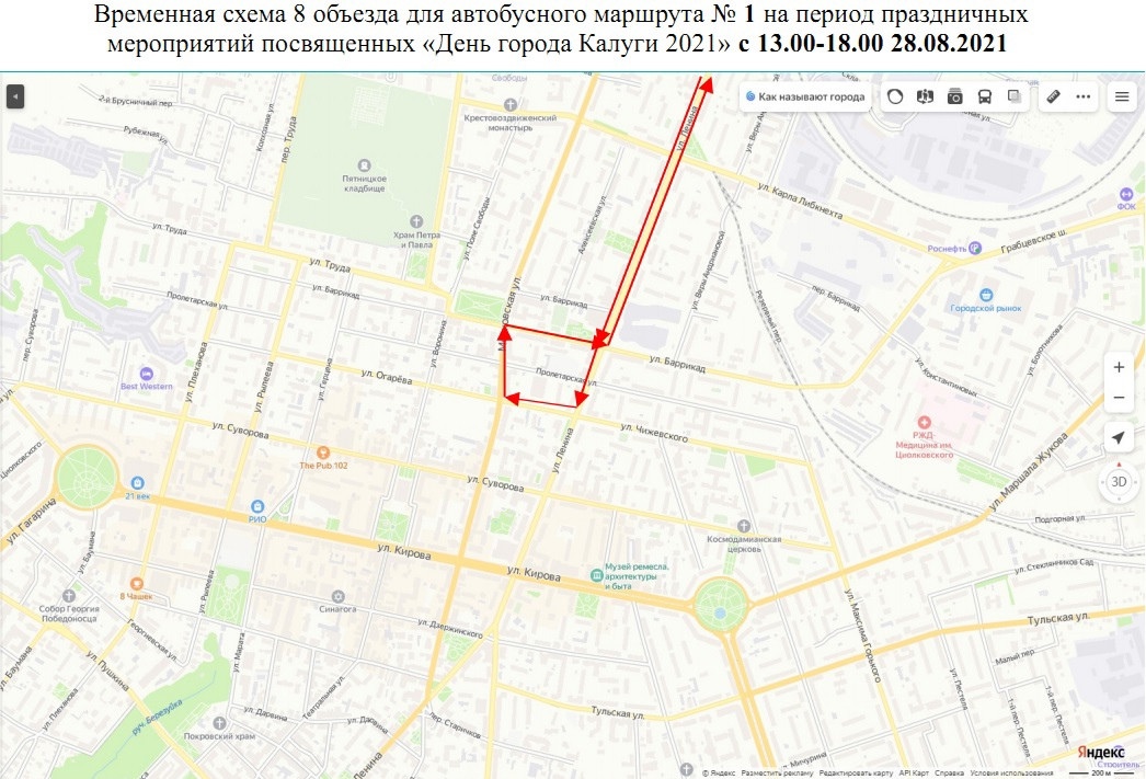 - маршрут № 1 будет осуществлять движение в объезд закрываемых участков через ул.Ленина-ул.Чижеского-ул.Московская-ул.Баррикад-ул.Ленина;