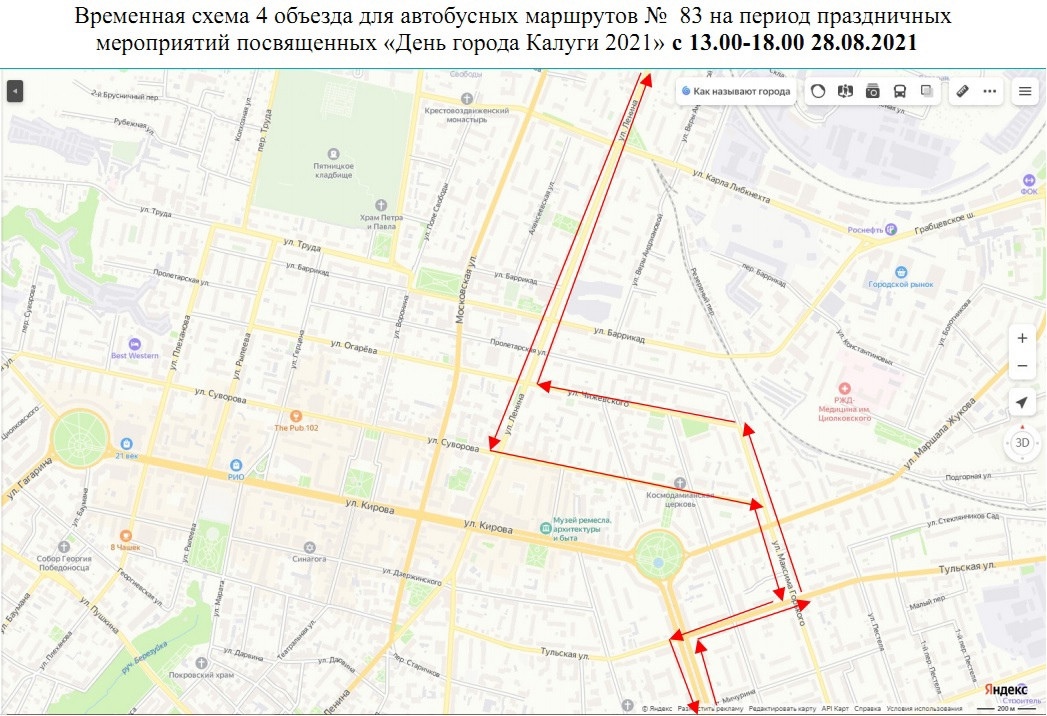 - маршрут № 83 будет осуществлять движение в объезд закрываемых участков по ул.Тульская-ул.М.Горького-ул.Чижевского-ул.Огарева (обр.ул.Суворова)-ул.Рылеева-ул.Кирова;