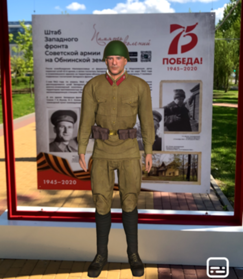 Горожане и гости города могут не только изучить представленную на двадцати стендах информацию, но и посмотреть материалы дополненной реальности. Это три видео — трейлер фильма «Подольские курсанты», интервью Георгия Константиновича Жукова, небольшой фильм о зажжении Вечного огня в 2019 году на обновленном мемориальном комплексе в Обнинске и три визуализации 3D-модели солдата времен Великой Отечественный войны, который рассказывает интересные факты о народном кинопроекте «Ильинский рубеж», Штабе Западного фронта, о ветеранах войны - жителях нашего города.
