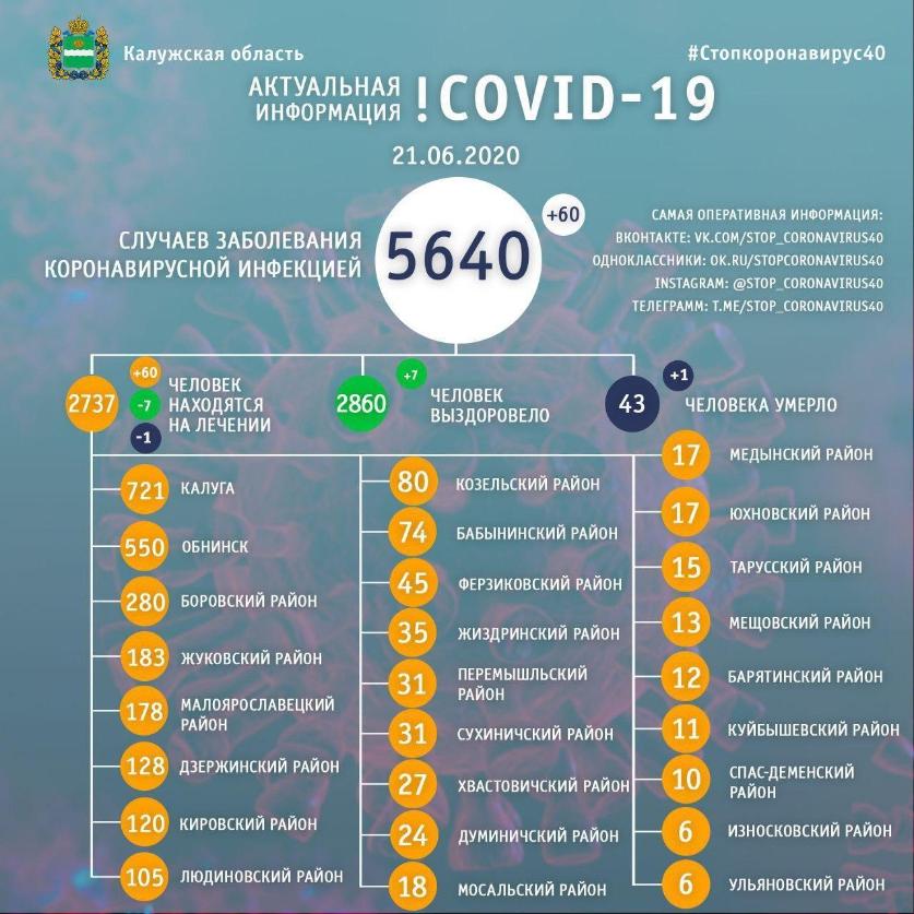 С начала пандемии в Калужской области всего зарегестрированно 5640 подтверждённых случаев заболевания коронавирусной инфекцией, из них 60 за последние сутки. 2860 человек выздоровело, из них 7 за последние сутки.
